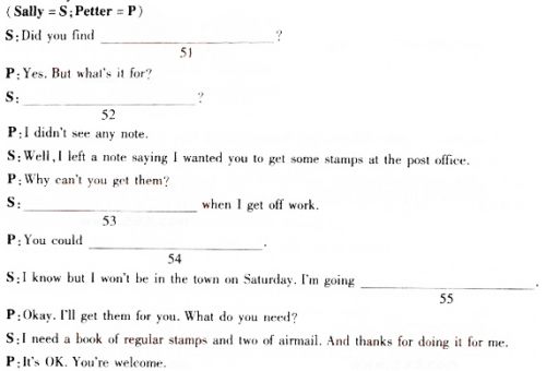 提示:Sally每天下班时邮局都关门了,本周六她又要与几位朋友去郊游。她想请Peter为她买几张邮票,她把钱和写好的便条放在书桌上,可是Peter没注意。最后Peter明白了是怎么回事,答应给她买邮票。