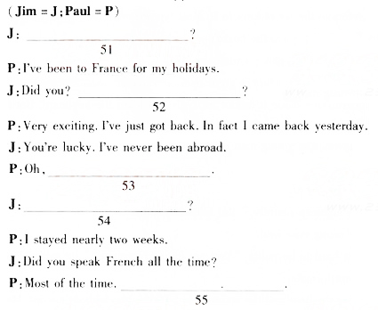 提示:Jim问Paul最近去了nJlUi,,Paul说他去法国度假了。Jim接着询问了度假情况,Paul说他已经去过法国两次,并且认为他的法语进步很快。