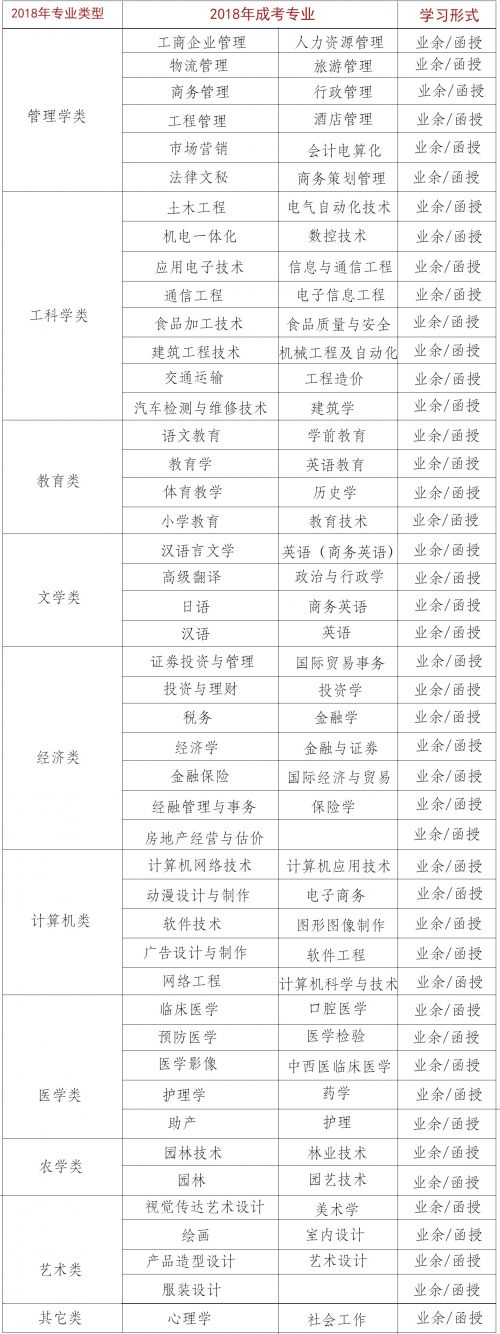 想参加成人高考的考生们在选专业的时候,要根据考生的兴趣、专业的就业前景等因素综合考虑,但是这之前,考生还是要先了解成人高考专业有哪些的,下面对2018年成人高考招生的一下专业进行汇总,希望能帮助到大家。