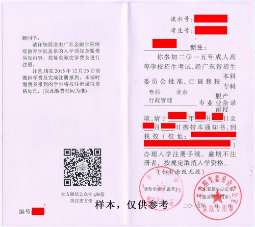 考生领取到有贵州省招生委员会办公室和录取学校联合盖章印发的《成人高等学校新生入学通知书》后请按照通知书上写明的时间和报到地址及时的去到现场报到注册,办理注册手续。