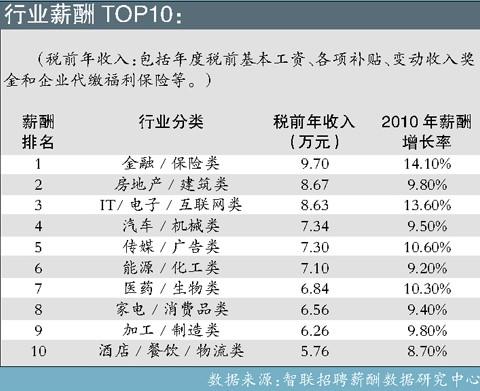 2010年各地相继出台的最低工资标准上调的政策,劳动力价格是否会因此迎来新一轮上涨?智联招聘薪酬数据研究中心昨日公布的2010年年 中薪酬调查,预计今年企业实际增长幅度将再次超过10%。在各个行业中,金融保险类企业员工税前年收入达9.7万元,位居各行业之首。