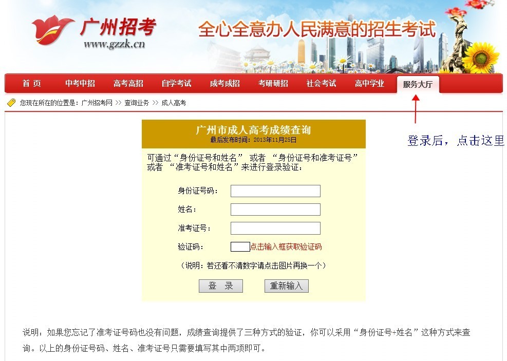 贵阳市的考生可以直接登录:贵阳招考网(www.gzzk.cn)查询成人高考成绩。在首页的频道栏点击“服务大厅”进入综合查询页面,选择【成考成绩查询】